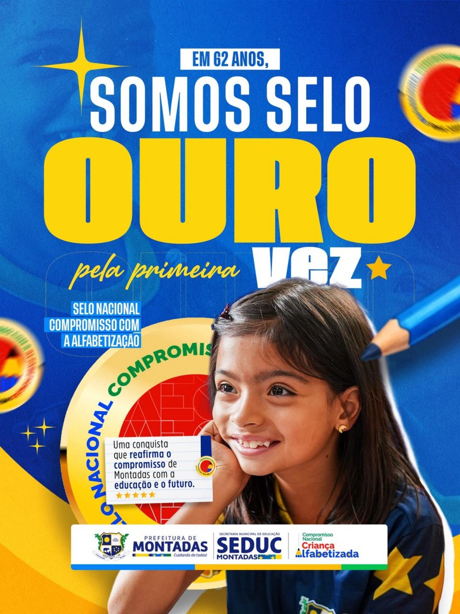 Pela primeira vez em seus 62 anos de história, o município de Montadas foi contemplado com o Selo Ouro do Compromisso Nacional com a Alfabetização (MEC 2025). O reconhecimento inédito marca um avanço histórico para a educação local.