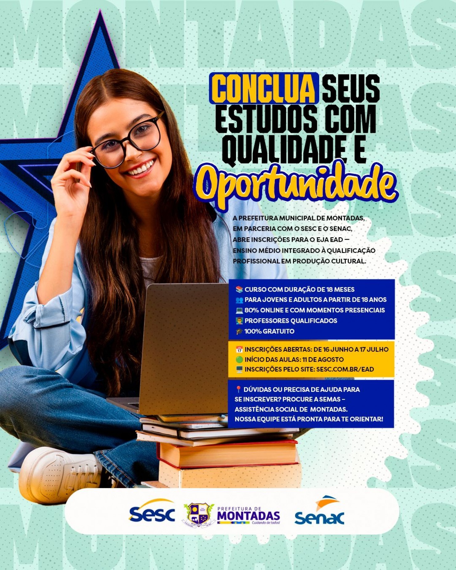 A Prefeitura Municipal de Montadas, em parceria com o SESC e o SENAC, informa que estão abertas as inscrições para o EJA EAD — Ensino Médio integrado à Qualificação Profissional em Produção Cultural. A iniciativa oferece aos munícipes a oportunidade de concluir o Ensino Médio com qualidade, de forma gratuita e com uma formação voltada para o mercado de trabalho.