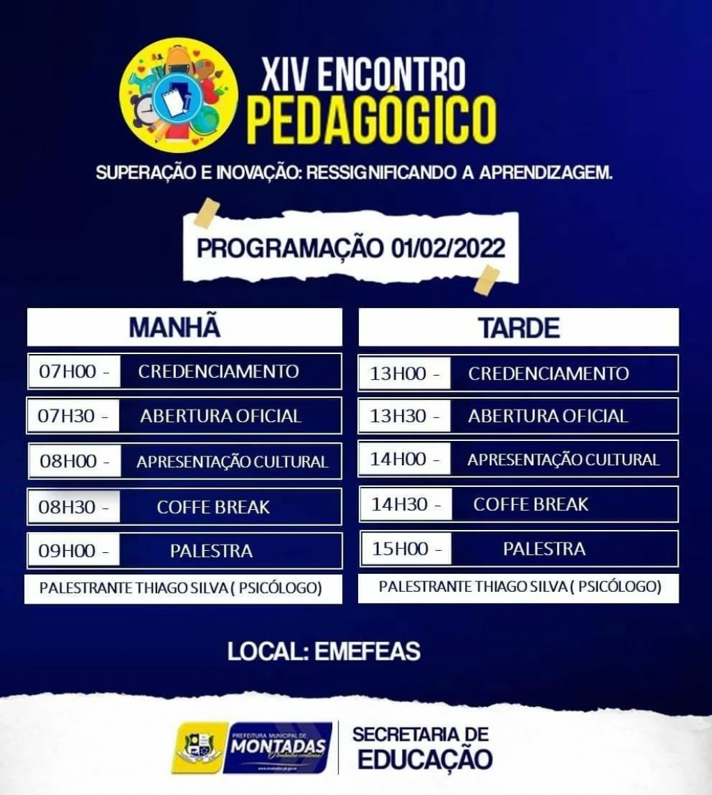 A Secretaria Municipal de Educação de Montadas realiza o XIV Encontro Pedagógico no município, que tem como tema: “Superação e Inovação: Ressignificando a Aprendizagem”. Nos dias 01, 02 e 03 de fevereiro. E o palestrante desse evento é o Psicólogo, Thiago Silva. Devem participar desse encontro os professores efetivos, diretores, orientadores escolares, supervisores e coordenadores pedagógicos da Educação Básica, vinculados a rede municipal de ensino.