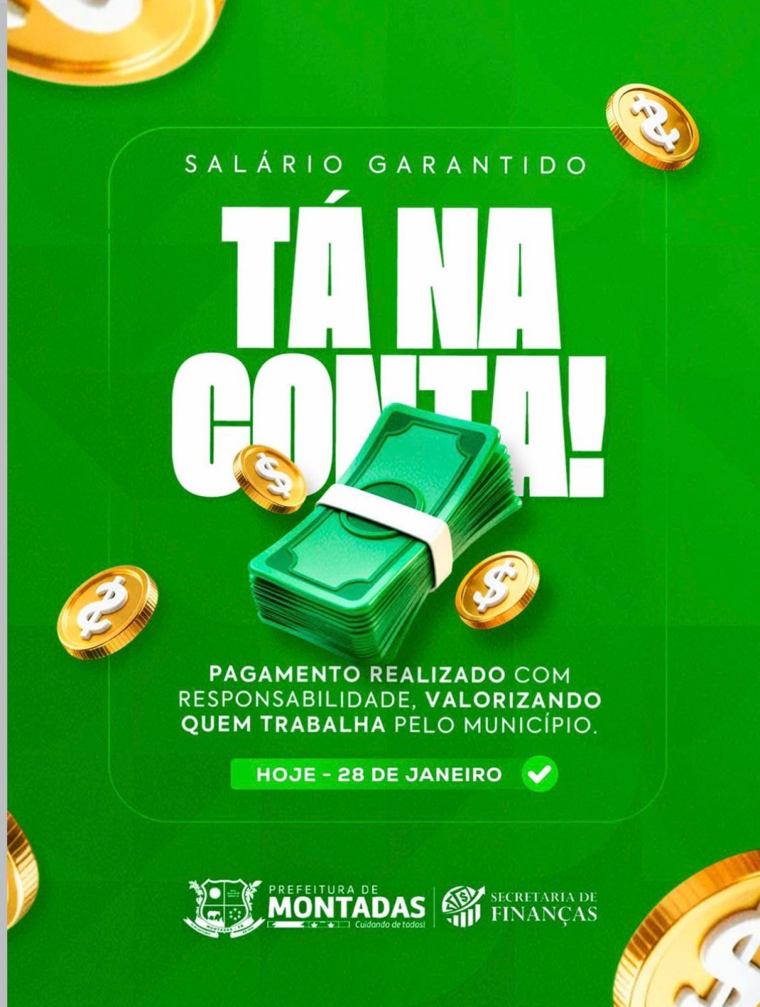 A Prefeitura de Montadas, através da Secretaria de Finanças, informa que o pagamento de todos os servidores municipais referente ao mês de janeiro já foi efetuado. A quitação dos salários no dia 28 reforça o compromisso da gestão com a saúde financeira do município e com a valorização do funcionalismo público.