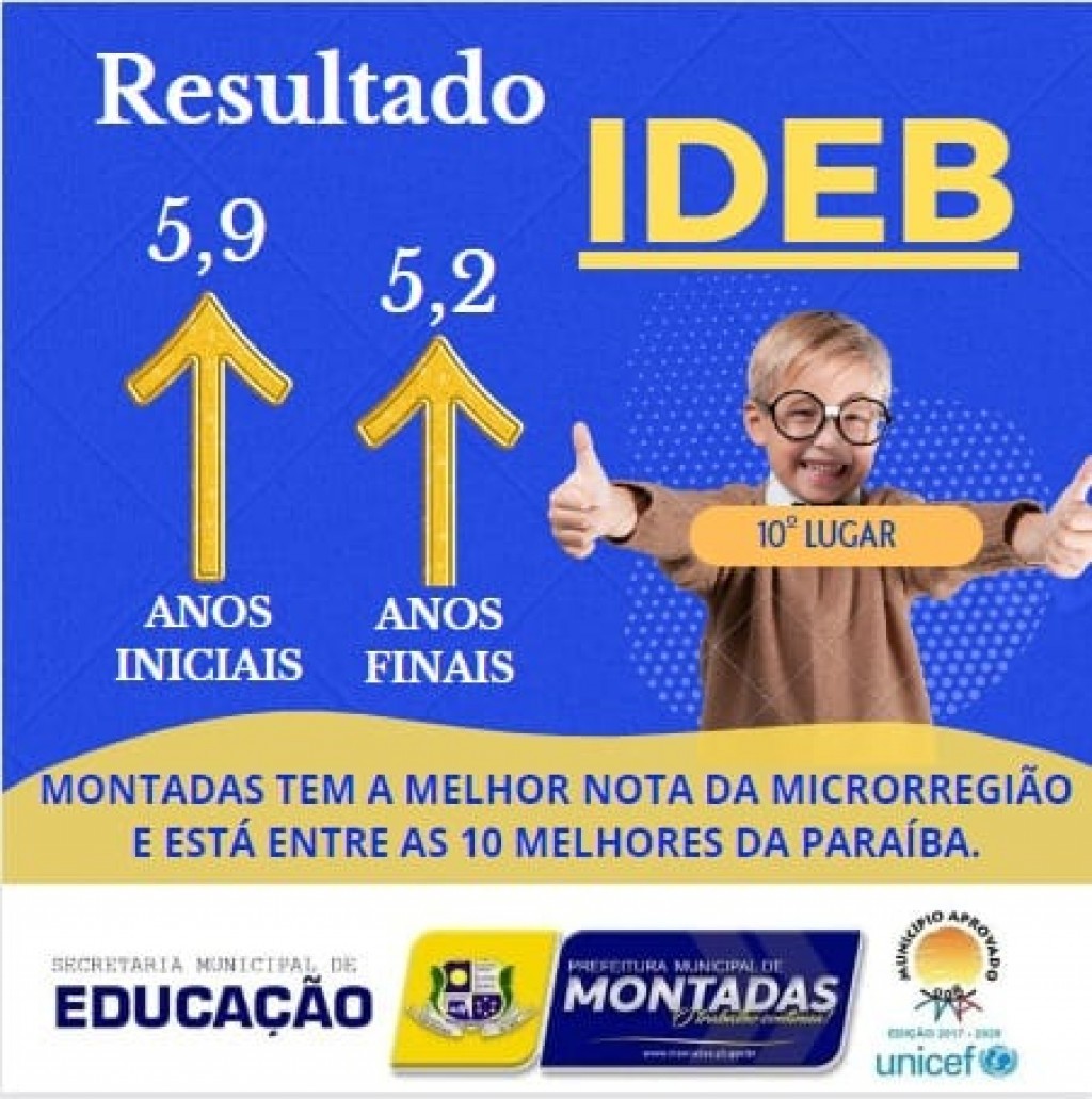 A Secretaria de Educação de Montadas divulgou a nota do IDEB, que é o Índice de Desenvolvimento da Educação Básica, uma importante ferramenta de acompanhamento da educação. O município foi destaque, recebendo a nota 5,9 nos anos iniciais e 5,2 nos anos finais. A melhor nota da microrregião e ficou entre as 10 melhores da Paraíba.