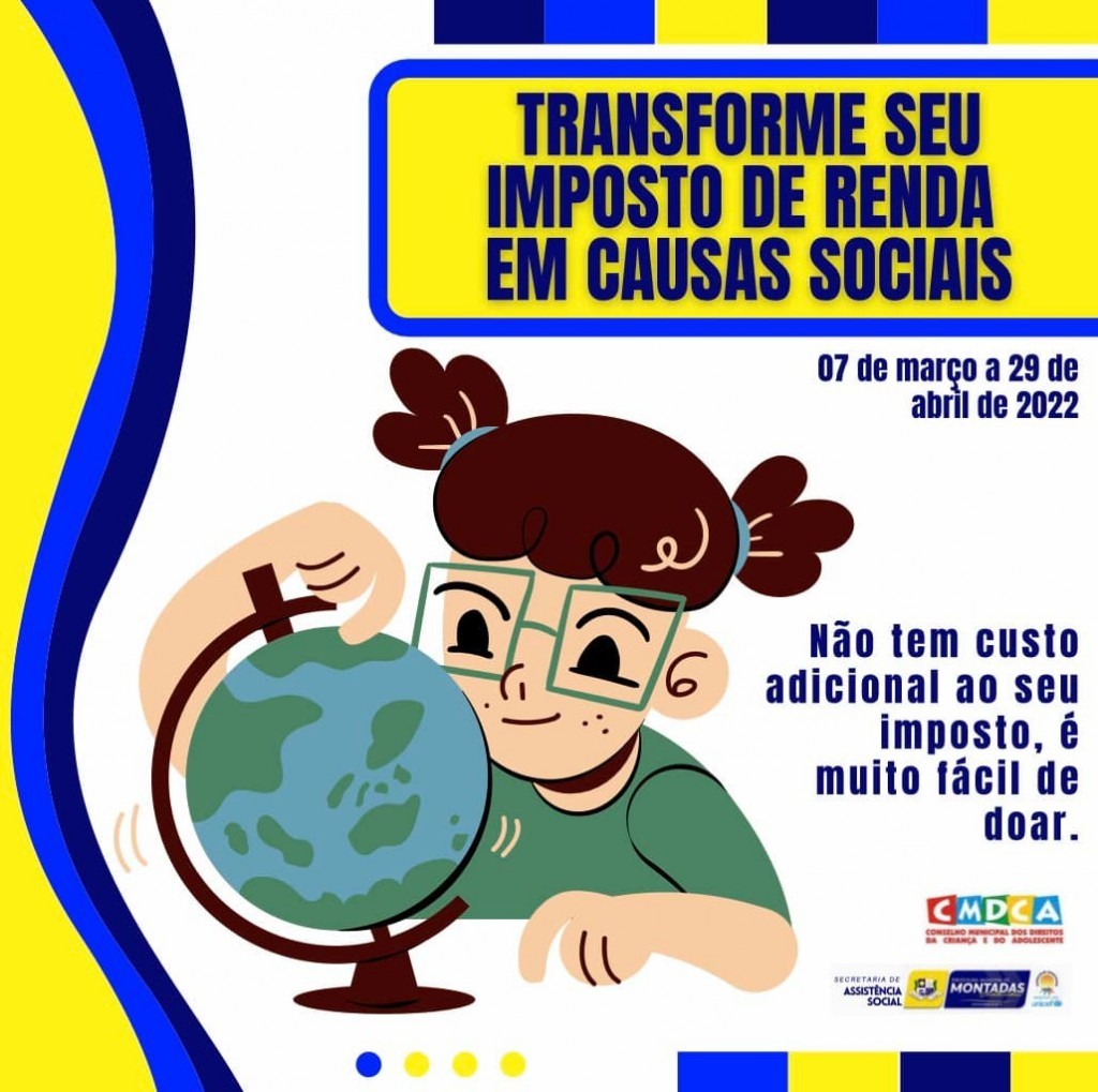 Para quem realizará a Declaração do Imposto de Renda, no período de 07 de março a 29 de abril de 2022, terá a oportunidade de destinar seu imposto ao Fumdca - Fundo Municipal dos Direitos da Criança e do Adolescente de Montadas/PB, regulamentado pela LEI N.º 330 de 20 de dezembro de 2006. E não tem custo adicional ao seu imposto, é muito fácil para doar.