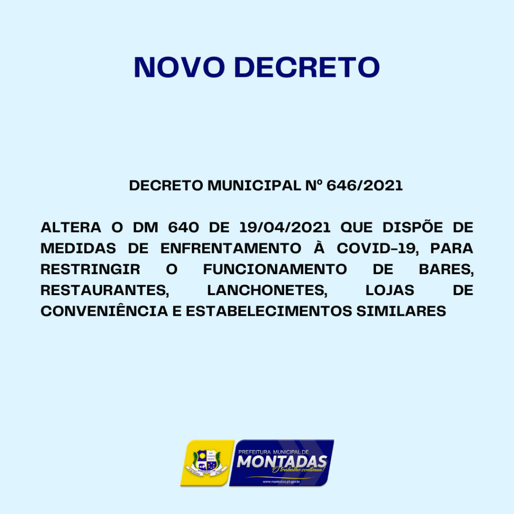A Prefeitura de Montadas publicou um novo decreto com medidas de enfrentamento à COVID-19, para restringir o funcionamento de bares, restaurantes, lanchonetes, lojas de conveniência e estabelecimentos similares, que funcionam com atendimento aos consumidores em suas dependências.