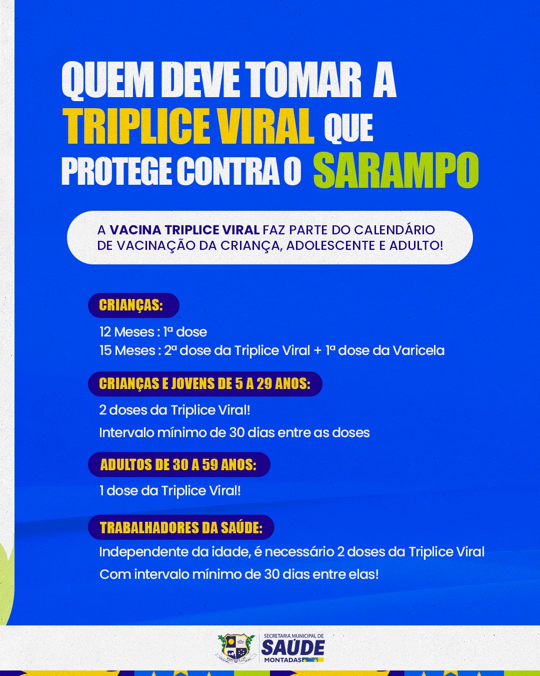 A Prefeitura Municipal de Montadas, por meio da Secretaria Municipal de Saúde, convida toda a população para participar do Dia D da Multivacinação, que será realizado neste sábado, 12 de abril, das 08h às 15h, na Sala de Vacinação da UBS Paulo de Souza.